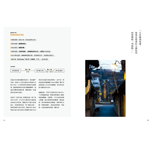 主流之外的地方,更貼近風土民情,讓人看見真實的日常生活。小鎮風情多半是靜謐的,是慢節奏的,於是你沿著時光的軌跡緩步,一邊享受遠離塵囂的自由自在,一邊也體會到日本的美好,有時候並不在於追求最潮最新,而是平凡卻使人回味無窮的點點滴滴。