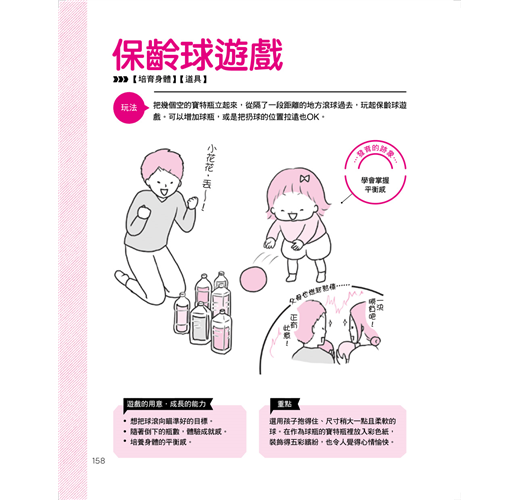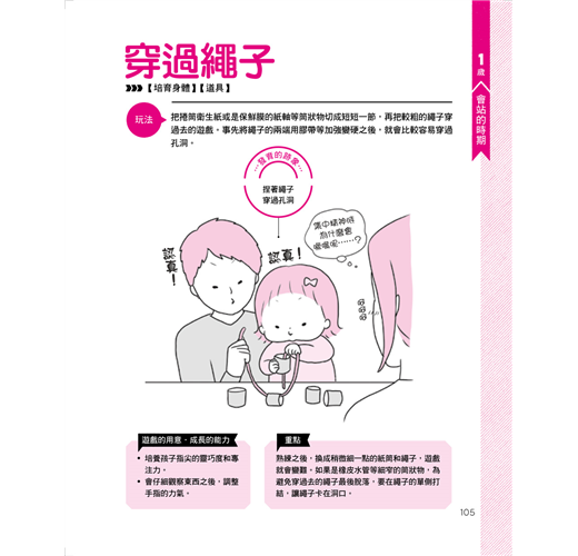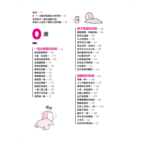 還有培育身體的戶外遊戲、培育心靈的自製玩具!0~2歲可說是寶寶的黃金成長期,這時他們開始學會翻身、爬行、走路、說話,同時也是培養認知能力的重要階段。如果能透過和父母互動、一起遊戲,就可以讓寶寶的身心獲得平衡發展,訓練出好腦力、好情緒與專注力。