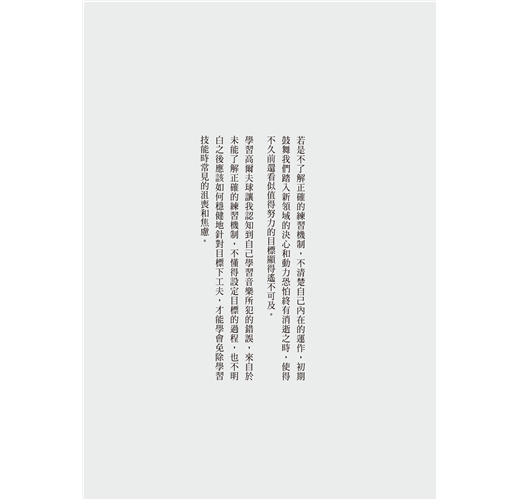 •我讀了很多關於練習的書,我是一個音樂家,一直都在使用本書的方法:1)專注;2)慢慢做;3)保持平靜。順道一提,我在一篇文章中讀到小提琴家帕爾曼的親筆簽名,寫著:「帕爾曼,慢慢練習。」