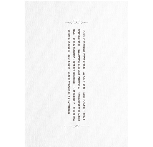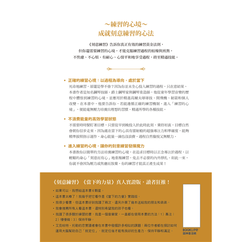 ★本書填補了「了解練習之道」和「真正精通技能」之間的鴻溝,並提供簡單的方法讓讀者於日常生活中運用。面對鬧情緒的孩子、工作量爆表或職場人際衝突,都可以運用練習的心境來處理。