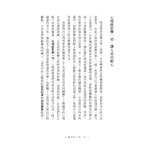 「我每天都運用《練習的心境》中的技巧。從商界領袖到在高爾夫球場上揮桿的青少年都深受這套方法的幫助。我也向所有的學生推薦這本書,因為他們將因此在球技和人生上受益。」──艾力克‧麥克倫,美國職業高爾夫球協會駐愛波克羅斯鄉村俱樂部高爾夫球教練團團長