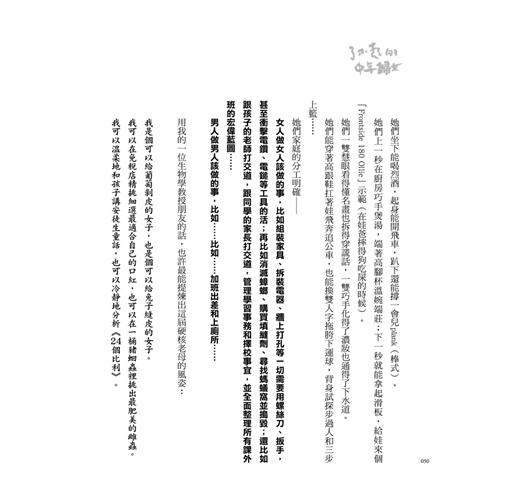 ▌女人做女人該做的事:比如組裝家具、拆裝電器、牆上打孔等一切需要用螺絲刀、扳手,甚至電鑽等工具的活;再比如消滅蟑螂、購買填縫劑、尋找螞蟻窩並搗毀;還比如跟孩子的老師打交道,跟同學的家長打交道,管理學習事務和擇校事宜,並全面整理所有課外班的宏偉藍圖……