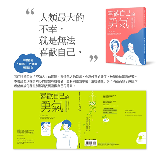 本書封面以探索內心的意象呼應書名,並特別雙面印製「溫暖橘紅」與「清新亮綠」兩版本,希望無論何種性別都能找到喜歡自己的勇氣。