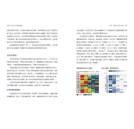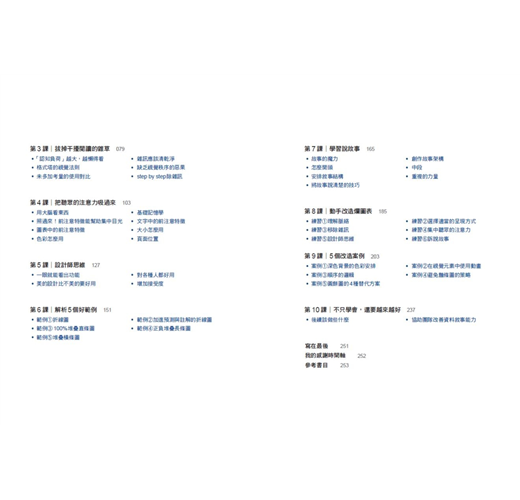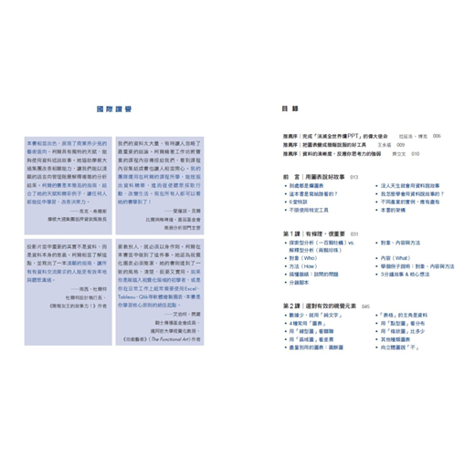柯爾所提出的「別跟著流行走」(刪減花稍的過場動畫、圖像和文字,以訊息為中心)、「簡潔才是王道」(簡報的重點是清晰易懂的故事,而非漂亮的數據圖)等,都是她的名作。最後,她決定寫下《Google必修的圖表簡報術》,至各地教學,完成自己「消滅全世界爛PPT」的偉大使命。本書至今已在全球各地推出十多種語言的譯本,不僅榮獲全球一百多所大專院校採用為教科書,且是成千上萬名學員參與的「用資料說故事」工作坊之教材。以下就是本書的內容:
