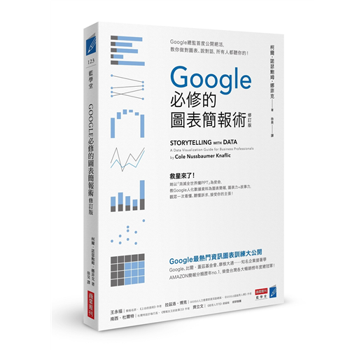 推薦序:完成「消滅世上爛PPT」的偉大使命 拉茲洛・博克(Google前人力營運部資深副總裁,著有《Google超級用人學》〔Work Rules!〕) 「權力(Power)使人腐化,但PPT(PowerPoint)導致絕對的腐化。」 ——耶魯大學榮譽教授愛德華・圖夫特(Edward Tufte) 每個人都有被投影片擺一道的經驗:字型、顏色、項目符號和醒目提示亂成一團,整個簡報變成一場慘劇,讓人想拋下麥克風直接離開。資訊圖表根本看不到資訊,讓聽眾怵目驚心。統計圖和表格甚至還會誤導聽眾,讓人越聽越是迷糊。 現代社會科技方便,信手拈來就能做出一張圖表。我能想像有個倚老賣老的傢伙(說不定我也是這種人?)站在我背後,邊搖著頭邊念念有詞,說什麼當年他們都要用手畫圖,下筆之前都要用腦袋好好想過。 全球的資訊垂手可得,但此般優勢並沒有讓溝通變得更輕鬆,反而產生了反效果。手頭的資訊越多,越難去蕪存菁、挑選出最重要的精髓。 於是,柯爾・諾瑟鮑姆・娜菲克來拯救大家了。 2007年末,我認識了柯爾。我在前一年獲Google公司招聘,負責召集「人力營運」團隊,為Google尋找人才、留住人才、並為內部員工安排休閒娛樂。加入Google不久後,我便決定成立人力分析團隊,並要求團隊成員讓人事方面的創新不輸給產品層面。柯爾獲選進入此團隊、成為關鍵創始成員之一,擔任分析團隊和Google其他部門的溝通橋梁。 簡潔扼要似乎是柯爾的天性。 她接收到的業務訊息都是最棘手、最難處理的資訊,像是「如何當個好主管」之類的主題,但她一向都能用這些資訊製造出最洗練、最好吸收的圖像,並用最有說服力的方式來訴說故事。「切勿讓數據跟著流行走」(刪減花俏的過場動畫、圖像和文字,以訊息為中心)、「樸素就是一切」(簡報的重點是清晰易懂的故事,而非漂亮的數據圖)等,都是她做過的精彩指南。 我們請柯爾到各地授課,在接下來的6年內開授了50次以上的資料視覺化課程,最後她決定出走,完成自己「消滅世上爛PPT」的偉大使命。如果你覺得這問題根本沒那麼重要,那就上Google搜尋看看「PPT害死人」(powerpoint kills)吧,結果將近有五十萬條條目呢! 本書是柯爾針對現下環境寫出的著作,替愛德華・圖夫特等資料視覺化先驅的作品進行補充與更新。她過去的合作對象包括全球資訊處理量數一數二的公司,也包括了一些使命驅動、資訊量極低的機構。無論對象為何,她皆能成功協助它們塑造公司訊息與思考模式。 柯爾的這本大作是一本有趣、平易近人又相當實用的作業指南,教導大家如何從一片雜音當中汲取出真正重要的訊號,讓我們的聲音更容易為他人聽見。 這不就是重點所在嗎?推薦序:把圖表變成簡報說服的好工具 王永福(頂尖簡報及教學教練,《教學的技術》《上台的技術》作者) 如何把資料轉化成圖表,變成簡報說服的工具?原來,Google 式的圖表簡報,是這麼做的! 身為簡報教練,不論是上台技術、簡報表現、視覺呈現、甚至投影片設計,每個領域我都會找到幾本經典書籍,不僅自己閱讀,也推薦學員參考。但關於圖表製作及資料展現,我卻一直找不到一本經典又簡潔的參考書籍。 但在專業及商業簡報中,如何利用圖表或資料表格,把大量的資訊化繁為簡、清楚呈現,卻一直困擾著許多簡報者。雖說「文不如表,表不如圖」,但有多少次我們被複雜的圖表搞到頭暈?又有多少次我們被大量的數據所淹沒?雖然依照不同的簡報個案,我們可以給一些不同的調整建議;但有沒有什麼更系統化的方法,可以幫助專業簡報者,更有效的呈現手邊的資料?讓資料不僅是資料,而是可以說服聽眾的有效工具? 這本書,提供了一個完整的解答! 從一開始作者就告訴我們,要先搞清楚對象是誰、他們想要什麼、他們的目標和需求。我非常認同這樣的觀念,因為唯有把目的跟對象弄清楚,接下來的簡報呈現及設計才有意義!而下一步驟,作者建議大家關掉電腦,從構思開始,用小紙片規畫一下接下來的呈現流程,才不會一開始就掉入電腦技巧操作的陷阱之中。這樣的方法也跟我平常教學採用的便利貼法非常類似,可見好的方法全世界都認同。 接下來作者開始用實際案例教導我們如何透過簡化、強調、消除、動態呈現、設計師思考等不同的原則,讓圖表更有效呈現。而搭配核心目標確認及說故事的手法,讓資料不僅是資料,而成為一大說服利器。 我最喜歡的是:本書搭配了大量的案例,精彩呈現出修改前及修改後不同的效果,甚至有幾個章節是以個案的方式呈現,逐步的把原本繁瑣的圖表,調整成非常具有說服力的精彩投影片。圖表彩色印刷,也對我們理解作者想表達的概念很有幫助。可以這麼說,這不是一本圖表設計理論的書,而是基於作者札實的經驗,配合上一個又一個的實務案例,所匯集而成的精彩簡報書籍。 對了,書上這些方法及技巧,也是作者在 Google 內部的教學內容。透過這本精彩好書,我們也能一窺什麼是 Google圖表簡報術。重要的是:如果你是專業人士,工作簡報經常需要用到圖表呈現,那我跟您保證,這絕對是一本值得您仔細閱讀、用心學習的好書。熟讀書中觀念,搭配個案實作,再規畫好您的資料呈現腳本,最後記得在上台前多練習幾次;相信您一定能善加使用圖表,為你的專業簡報加分。 願你上台自在,自信上台,一起加油!推薦序:資料的清晰度,反映你思考力的強弱 齊立文(《經理人月刊》總編輯) 某一場簡報結束後,有