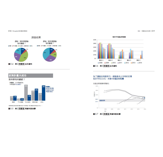 摘錄1_前言∥用圖表說故事 ●到處都是爛圖表 我在工作上經常碰到許多不盡理想的視覺圖表(日常生活中也是,開關一開了就停不下來了)。沒有人會刻意製作爛圖表,但是爛圖表還是層出不窮。所有業界、所有公司、所有類型的人都有可能做出爛圖表,連媒體也會做爛圖表,連應該要有些水準的人也會拿張爛圖表出來給聽眾看。為什麼會這樣?五顏六色的圖表你應該不陌生,但,看得懂嗎? ●沒有人天生會用資料說故事 學校老師教導我們語言與數學。在語言課程上,我們要學習將字詞組成句子、將句子組成故事;在數學課上,我們要學習搞懂數字的奧秘。不過,卻很少人將這兩項科目結合在一起,教我們如何用數字說故事。不僅如此,大半人都對於此領域相當沒有天分。 現在資料呈現的作業需求越來越高,但是我們卻毫無準備。隨著科技進步,我們唾手可得的資料量越來越龐大,這些海量資料也等著我們去破解。此時,將資料視覺化、用來說故事的技能,即成為了將資料轉為資訊、改善決策能力的關鍵。 在缺乏天分和訓練的情形之下,多數時候我們只能仰賴工具。科技日新月異,不只因此使得資料越來越龐大、越來越唾手可得,同時也使得處理資料的工具日漸普及。任何人都能將資料輸入繪製圖表的程式(例如Excel)、製作出圖表。這句話相當值得深思,所以我再重複一遍:任何人都能將資料輸入繪製圖表的程式(例如Excel)、製作出圖表。以前只有科學家或其他高技術人員才有資源製作圖表,想到這點就令人驚歎不已,同時又讓人覺得相當害怕。畢竟,沒有清楚的指引,就算原意再良好、付出再多心血(再搭上不禁令人挑眉的工具預設值),我們可能會誤入歧途,做出3D立體、毫無意義又五顏六色的圓形圖。 科技讓資料處理工具日漸普及、也大幅提昇了此類工具的效率,但是使用者本身的能力卻可能相差甚遠。任誰都會把資料輸入Excel、製作出一張圖表。對許多人來說,資料視覺化就這麼簡單。資料當中的有趣故事很可能因此變得平淡無奇,或是導致更悲慘的後果—讓人難以理解。工具預設值和基本技巧通常會讓資料變得空洞又索然無味,完全缺乏故事性。 你的資料裡頭有著故事,但是工具不知道這個故事究竟為何。這時候,就必須由你擔任資訊的分析師或溝通師,以視覺和脈絡讓這個故事為人所知。本書便將重點放在把故事搬到幕前的流程。接下來是幾個改善前後的例子,讓各位讀者親眼看看本書的價值;我將會一步步詳述各項要點。 讀完本書之後,會讓你從單純展演資料,變成用資料說故事。 ●這本書是寫給誰看的? 本書的目標讀者為需要用資料與他人溝通的人,包括了(但當然不僅限於):需分享工作結果的分析師、要將論文資料視覺化的學生、需以資料導向方式交流的主管、欲證明自己影響力的慈善機構、以及要向董事會交代的公司領導階層。我相信,任何人都可以加強自己的溝通能力與效率、更得心應手地使用資料與他人交流。此領域讓許多人聞之喪膽,但是其實真的沒必要抱持著這種態度。 若有人要你「拿點資料來看看」,你心中會有何感覺? 或許你會覺得渾身不自在,因為你根本不知道該從何下手。或許你覺得自己應付不來,因為你假設觀眾聽了簡報後會有更複雜的要求,你還必須擺出所有細節、以回答觀眾的所有問題。或許你已經有些紮實的底子,但希望能讓你的圖表和資料裡的故事更上一層樓。無論是哪種情況,這本書都是為了你們量身打造的。 現今的世界資料大量增加,決策過程也越來越偏往資料導向,用資料說故事的技能因此也跟著越趨重要。成功與失敗僅一線之間,無論是要傳遞研究發現、為非營利組織募款、向董事會報告、或僅僅是將論點傳達給聽眾,高效率的資料視覺化圖表絕對能助你一臂之力。 我從經驗中得知,大多人都會面臨到類似的挑戰:他們知道有效率地用資料溝通的確有其必要,但是卻自認在這方面技能不足。擅長資料視覺化的人才相當少見。挑戰之一在於,要將資料視覺化,就必須踏進分析流程。職位與分析相關的職員自然有數據處理的背景,同時也能輕鬆地進行其他分析步驟(尋找資料、整理資料、分析資料、建構模型),但是他們不一定受過正式訓練,能夠有效率地傳達分析結果,不過通常在所有的分析流程當中,聽眾就只會注意到呈現這一層面。除此之外,世界越來越傾向資料導向,沒有技術背景的職員卻更常被要求要進行分析、並使用資料交流結果。 你對此領域可能會有的的不自在感其實相當普遍,因為傳統教育的課程內容並不會教如何有效率地使用資料進行交流。通常精通此領域的專家,都是透過不斷的嘗試和失敗累積經驗,琢磨出自己的一套方法,但是過程可能漫長又繁瑣。因此,我希望能透過本書,讓各位讀者一步登天。 ●我怎麼學會用資料說故事的? 數學和商業的交集一向讓我感興趣不已。我有數學和商業的教育背景,因此,雖然這兩個領域有時天差地遠,我還是能順利與雙方溝通交流,並且幫助雙方更進一步瞭解彼此。我喜歡使用資料科學來改善商業決策力。隨著時間累積,我發現成功的關鍵之一,就是必須能有效地用視覺交流資料。 最早發現此領域有多重要,是我剛出社會、拿到第一份工作時。當時我從事的工作是信用風險管理分析師(那時還沒發生次貸危機,所以其實還沒人知道信用風險管理是什麼東西)。我