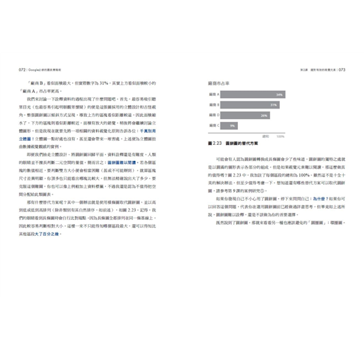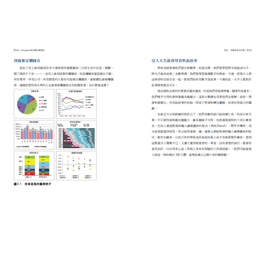 摘錄1_前言∥用圖表說故事 ●到處都是爛圖表 我在工作上經常碰到許多不盡理想的視覺圖表(日常生活中也是,開關一開了就停不下來了)。沒有人會刻意製作爛圖表,但是爛圖表還是層出不窮。所有業界、所有公司、所有類型的人都有可能做出爛圖表,連媒體也會做爛圖表,連應該要有些水準的人也會拿張爛圖表出來給聽眾看。為什麼會這樣?五顏六色的圖表你應該不陌生,但,看得懂嗎? ●沒有人天生會用資料說故事 學校老師教導我們語言與數學。在語言課程上,我們要學習將字詞組成句子、將句子組成故事;在數學課上,我們要學習搞懂數字的奧...