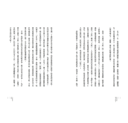 我第一次被叫「大姐」時,就是這種感覺。當時我在某家餐廳,服務生遞上飲料後,親切的說:「大姐,妳的綜合果汁好了!」我如遭雷擊,口中酸苦滿溢,哪裡還喝得下。靜靜的與那杯飲料相對,這一天就這樣來了嗎?這麼快就從「小姐」變成「大姐」,人生與我所期待的真是相去甚遠……還好女人年紀愈大愈摳門,不管多難過都會立刻回到現實,...