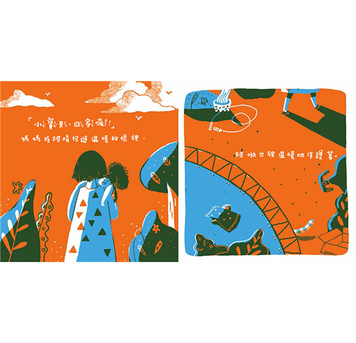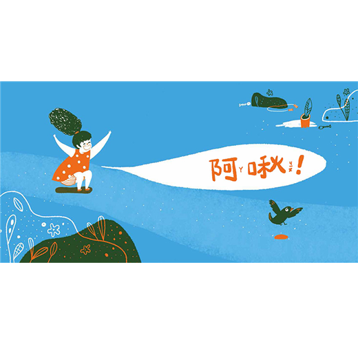 星月書房首本嬰幼兒繪本──《阿啾在哪裡?》選用對比強烈的藍、橘、綠、白四色,在活潑的色塊上,點綴豐富的質地與線條,搭配動態感十足的構圖設計,為視覺發展尚在起步的嬰幼兒,帶來特殊的感官刺激與體驗。