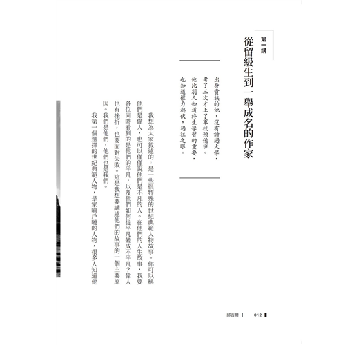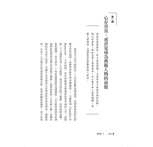 目錄 邱吉爾 第一講從留級生到一舉成名的作家 第二講 戰地記者經驗,讓他對大英殖民主義充滿批評 第三講 南非:入獄越獄,膽識,從此改變邱吉爾 第四講從戰地英雄變成政治明星 第五講沒有人不犯錯,也沒有人是天縱英才 第六講從受盡排擠噓聲,再度登上歷史舞台 第七講《第二次世界大戰回憶錄》 第八講戰時內閣與下野人生 第九講這一生,受夠了!不必遺言 戴高樂 第一講為法國而生,為法國而亡 第二講遠見的另一個代名詞:孤獨與誤解 第三講成立流亡政府,不投降的戴高樂 第四講寬恕你的政敵,讓法國團結一致 第五講看破戰後人性,瀟灑下野 第六講「我的生命屬於法國,我的身體屬於家庭」 羅斯福 第一講心存善良,或許是成為典範人物的前提 第二講不當政治精算師,專挑民主黨落後選區 第三講經濟大蕭條,一個小兒麻痺症的總統上台了 第四講新政,美國歷史上沒有總統超越他 第五講美國政治經濟史最大的革命 第六講美國意外嚐盡二戰甜頭 第七講 永遠為被遺忘的人努力
