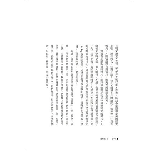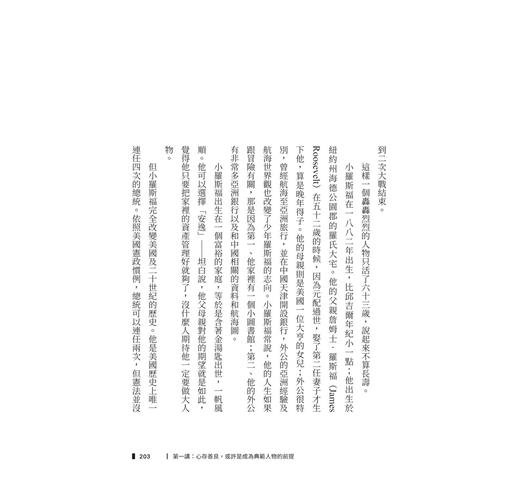 序與典範同行 他們的世紀瘋狂,腐敗,甚至沒有人性;他們卻一直活得清醒,孤獨,一定程度的豁達,終而死後成為世紀典範。 我不喜歡他們的故事被人遺忘。在這個以成功、權位成敗、短視地看歷史的年代,我們甚至比二十世紀的人,更需要他們。但他們走了,我們不能擁有他們的身影及領導,但至少我們還是可以擁有他們的故事。 在追逐他們一生的年年歲歲中,我們習得何謂長遠的眼光,了解良知及遠見並非注定孤獨,並且依託了我們心中仍然想擁抱的價值。 於是在這些偉人的傳記敍事中,我們找到了一起看時代的角度,習得自己逆境時如何自處的能力,也提醒身處順風時,你該為社會付出什麼。 三位典範人物五十年前或七十年前都已靜靜地躺下。當代無論多麼迷失胡鬧荒誕,世事都已與他們無關。與其說他們需要我們了解他們的故事,不如說我們需要他們的故事。在當代那麼多令人失望的政治表演裡,我們內心深處的沮喪,可以在他們的人生故事中,終而找到安慰。 原來邱吉爾也曾經這樣走出來的⋯⋯原來戴高樂是如此蒼白地被趕出巴黎的⋯⋯原來羅斯福總統日以繼夜完成的新政,曾經被美國大法官五:四部分判違憲⋯⋯ 原來對不是對,輸不是輸。原來歷史就充滿了荒謬性,原來人民就是善良與無情的混合物。 我的青春時期,凡他們三人之傳記、演説、著作:他們的淚,他們的痛,他們的冒險,他們的膽大,他們的榮耀感,他們的無私,他們的勇氣,他們的孤獨,他們的殞落,陪伴也貫穿我至少二分之一的人生。 如果這一生我曾經無所懼怕,笑看權力得失,明白時代本來大多時刻是由誤解與荒謬組成的。這些二十世紀典範人物,一直是我的精神依託。 他們的人生以渺小啓程,以偉大結尾。如果仔細閲讀,你會發現從邱吉爾、戴高樂到小羅斯福,沒有一個人從小立志當偉人。 使他們成為偉人的關鍵都是:無私。 邱吉爾小時候甚至被貴族爸爸視為廢物;小羅斯福除了心腸比一般人溫暖良善外,父母只希望他當個普通律師,管好家產;戴高樂出身法國中產階級家庭,他在乎的從來不是不是個人成就,而是法國戰敗的屈辱。 他們的人生往往從一個點開始,例如良知:邱吉爾在蘇丹看不慣英軍的屠殺,遞出辭呈,離開軍旅,之後意外走上政壇。二十六歲的政治明星,第一場演說,即道出了大英國四十五年後必然面臨的困境,以及一百年後的殞落。因為良知,他離開了軍隊,也因為良知,他選擇進入政壇不媚俗不歌頌偉大的日不落帝國,他坦承説出了國家的危機⋯⋯之後他得到的當然不是掌聲,而是同黨議員及支持者的噓聲,很大的噓聲與怒罵聲。 那是他政壇的第一步。 詩人説:向著月亮出發,即使不能到達,也能站在群星之中。羅斯福從政的每一場選舉,都挑他的政黨民主黨過去必敗的選區。這太特別了!看看我們當代的政治精算師,再對比這些人,你會發現你心中篤信的美好,不是那麼可笑。因為這些精算師嬴得的權力,永遠只是一時。他們不會成為後代人們記載的典範人物。 你以為這些典範人物,只是上世紀的故事,彷彿已經永遠消失了。 死亡不是失去了生命,只是走出了時間。他們不活在我們的當代,卻可以透過閲讀活在我們的心裡。 我們從典範人物在歷史時刻的自處裡,找到人性的高度。於是我們不必再相信那套成功邏輯,把自己的尊嚴往地底鑽,把自己的良知往黑暗裡遮蔽。我們不必再相信所有的成功都必須靠偽裝、靠忘記什麼叫良知。這些典範鼓勵了我們,使我們相信可以選取自己內心真實的聲音。 一部典範人物作品,不只是一本書。即使自小對他們的往事即倒背如流的我,每次重讀,都好像初讀那樣,帶來啟發。 因為人,很容易在潮流中,迷失,或是沮喪。 我們都只有一生,請不要糊裡糊塗地浪費這一生。墓穴裡躺著各種不同的軀體,有人好好為自己、為堅持某些良知、為國家的榮耀,活過一生。有人只是庸俗的永遠附和他人一生。 有一種寂寞,是不為身邊的人所了解的寂寞。還有一種寂寞,是茫茫天地之間,無邊無際之間,人竟然只能不斷模仿他人,始終活在沒有臉孔的狀態。 「地球正一點點的疏離月亮,據說每一百萬年就會陌生一秒,早在二十五億年前,我們便開始了漫長的別離。」 你是你?還是你是當代的、大眾的、風向的、順勢的⋯⋯你在哪裡?你是否早已別離了自己? 不要輕易翻過這本書的任何一段,我相信它可以讓你的青春或是人生,留下更多瀟灑的印痕。 不必害怕,當他們三個典範人物陪同你時,世間沒有什麼值得害怕的事。 他們不是遠方星辰,因為此書,他們正陪伴在你身邊。