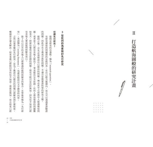 因此,對於想要進行研究工作的學生,這本書可以當作類似操作手冊的概念來研讀。從如何選擇研究題目開始,然後進行文獻探討、設計研究的方法、執行研究的過程,到最後生產一篇論文,可以參照書中所建議的做法一步一步進行。當然,書中所介紹的KJ法,可能不是本地學者熟悉或常用的研究方法,但是研究者還是可以代換成自己所選擇的研究方法來執行,整個概念和過程是可以通用的。