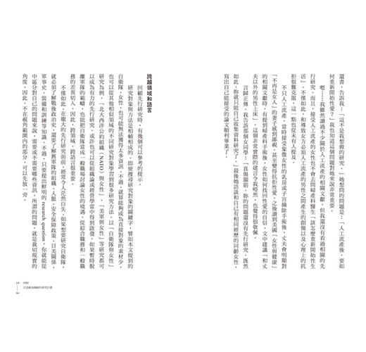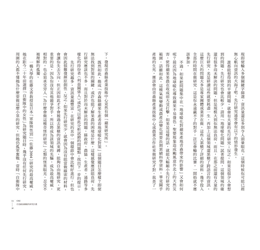 更有意義的是,作者用非常平易但明確的說法,告訴讀者這些規定背後的意義。因為多數的研究者,往往只是遵循著學術社群長期所訂定的規則從事研究工作,但對於這些規定背後的理論或是用意並不清楚。上野千鶴子透過自身的實踐經驗,說明這些規則制定的背後因素,讓我們可以知其所以然地做研究。雖然她謙稱這本書不涉及「方法論」的範疇,但在我看來,書中已經讓我們窺探到方法論的內涵。