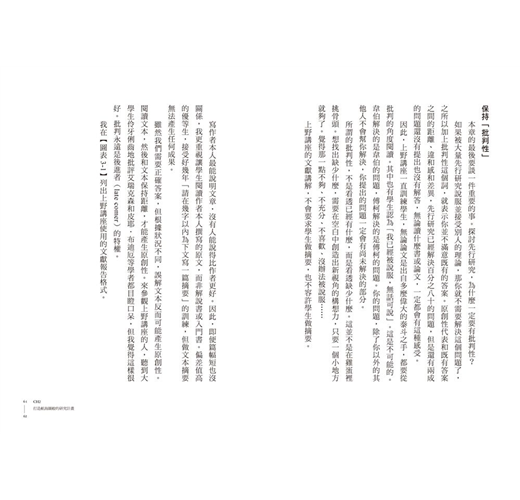 這是一本非常「親切」的學術書籍,我所謂的「親切」,意思是作者所採取的敘事策略,是以口語化的方式敘述研究的概念,並以實際案例做為說明,引導讀者逐步走上研究的道路。對讀者而言,閱讀的過程便宛如跟著作者進行學術研究,最後生產出論文。看似生動輕鬆的論述方式,其實是上野千鶴子集畢生功力,著述出來的嘔心瀝血之作。