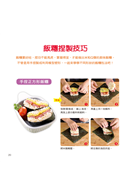 介紹多種飯糰(正方形、三角形、圓形、圓餅形等)、壽司(正捲壽司卷、花壽司)的捏製技巧,以及飯卷手卷米堡的製作,適合全家人一起享受手作的樂趣。