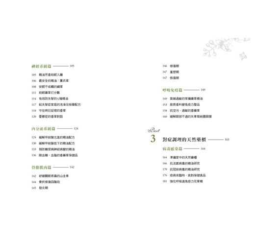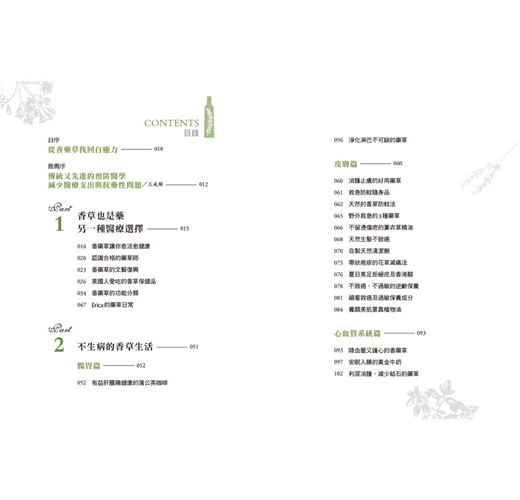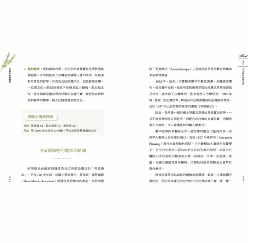 利用香藥草天然、副作用少與無抗藥性的特點,開啟無毒療癒生活。書中系統性分類不同器官、身體系統、各種族群,針對生活大症小病,以至居家無毒清潔的各項香藥草使用方法與配方。