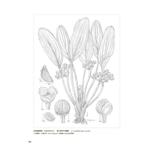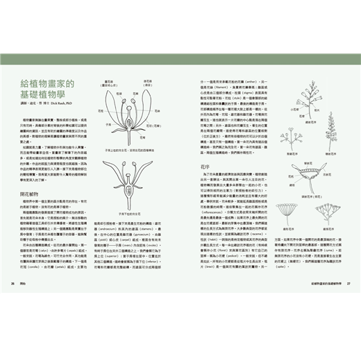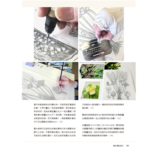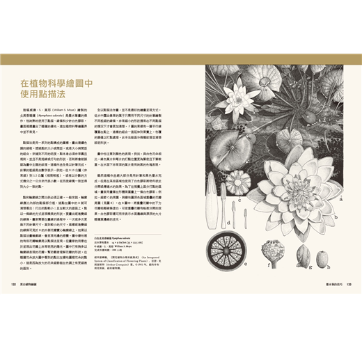 比方「如何使用針筆繪製一幅完整的植物科學解剖圖」一章,邀請到世界頂尖植物科學繪圖畫家做示範,從最基本的握筆使用、如何清理堵塞墨水、分析不同粗細筆頭繪製工具操作等,到植物資料搜集、標本選取使用、將初始草圖傳給科學家審核前需達到的標準、在印刷構圖排版上必須留意的重點、腺點等細毛適合的繪製法、萼片上的紋脈為何採點描而不建議使用連續線……諸多實務但又不容易得知的原理密技,都可以在享受精美的範例畫作中得到解答。