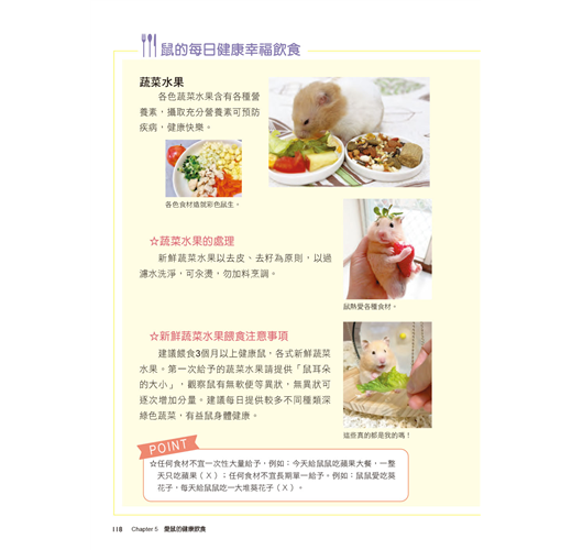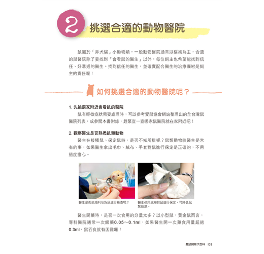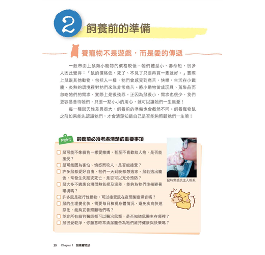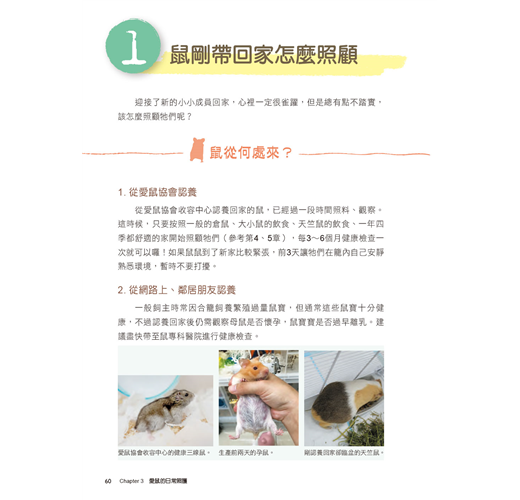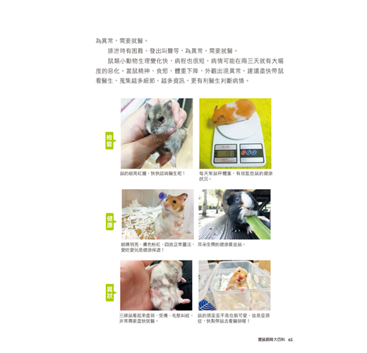‧疾病醫療:透過每日觀察來確認鼠寶的健康狀態,萬一生病該如何尋找動物醫院進行檢查,還有專業獸醫師分享的鼠類好發疾病等知識。
