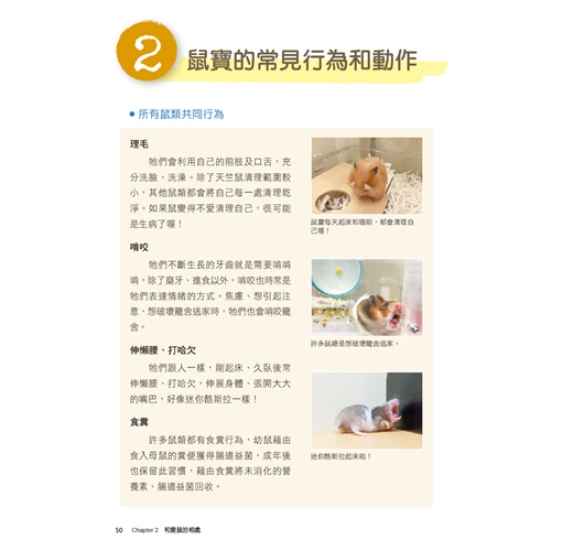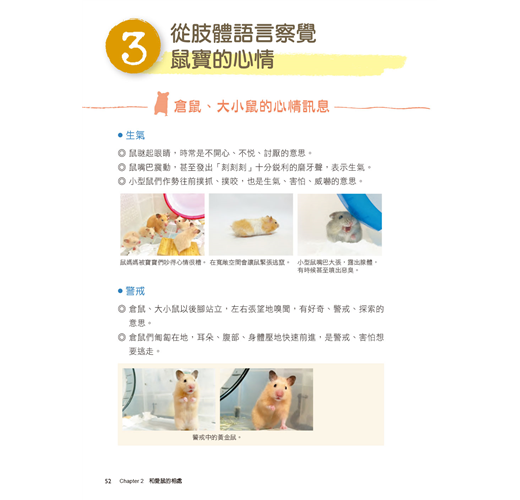 ‧日常照料:日常的飲食、衛生護理、環境衛生,還有如何抱鼠寶,以及懂得解讀牠們的心情,才不會惹鼠鼠生氣或不開心。