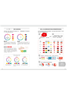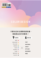 本書包含紅、橘、黃、綠、藍、紫、粉紅、棕、黑9大色系,每種色系下又分別有深淺不同的6種風格色彩提案──流行風、自然風、可愛風、時尚風、商務風、和風。每種風格都會介紹出色的配色方案輔以原創實例,並加以解說主色的有效配色模式。
