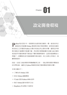 本書包含三大篇幅,第一篇談的是物聯網的「網」。你會製作一些端對端的物聯網app來透過網路控制LED,接著學習如何使用Python來建立各種RESTful API、WebSocket API與MQTT服務。第二篇則是介紹電子電路與GPIO介接的重要觀念。到了第三篇,重點轉到物聯網的「物」,你會學到如何透過Python來連接與控制各種電子感測器與制動器,主題包含了馬達控制、超音波感測器測距與量測溫度。最後,我們還要告訴你如何用Python來實作許多進階的物聯網技術、整合各種物聯網資料視覺化與自動化平台,並完成一個相當厲害的物聯網專案。