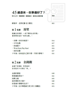 書籍數量雖多,大都是令人眼花撩亂的投資理財書,另外還有一些談熟年生活的勵志小品,把退休(尤其提早退休)全部面向完整陳述的幾乎看不到,就當是老王賣瓜,我認為對讀者來說,《45歲退休》仍是這類書籍中,至今最不可不讀的一本。