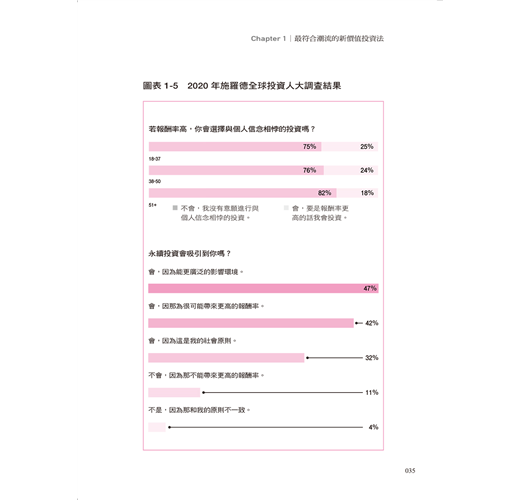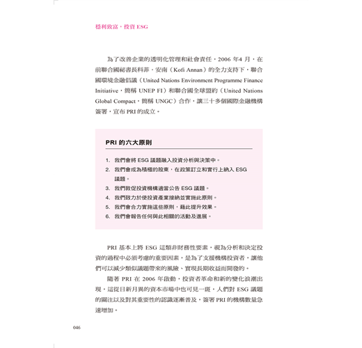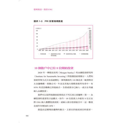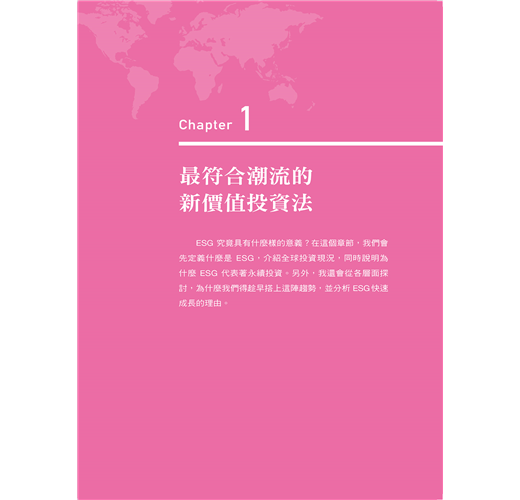 我很喜歡書中的一段話:「雖然投資可以讓你賺錢,但它同時也是可以實現新價值的方法。利用ESG投資,我們可以一邊獲利,一邊擴大社會共同價值。」