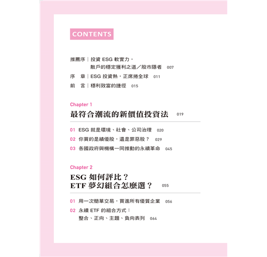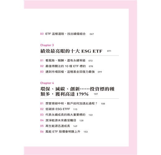 目前市面上較少投資ESG的相關書籍,因此也讓這本書顯得格外重要。本書除了介紹概念,也分享如何挑選ESG標的,並介紹全球相關的ESG ETF、分析各種投資範例,對於想了解永續投資的讀者來說,是一本非常值得閱讀的書。