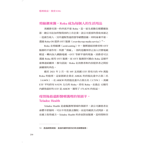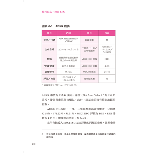 第六章則提到利用ESG創新來持續發展的永續投資。具體來說,我會在這章分析引領ESG投資創新先鋒的方舟投資(ARK Invest),從其代表性的ETF,來探討ESG ETF的績效。