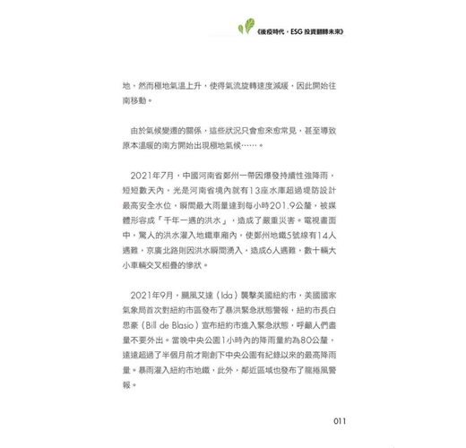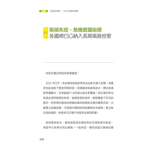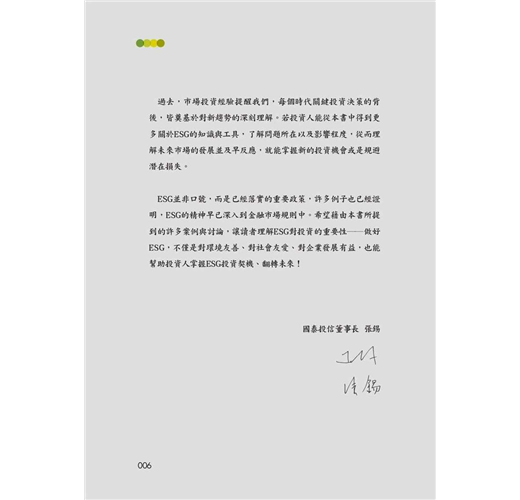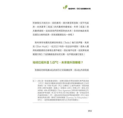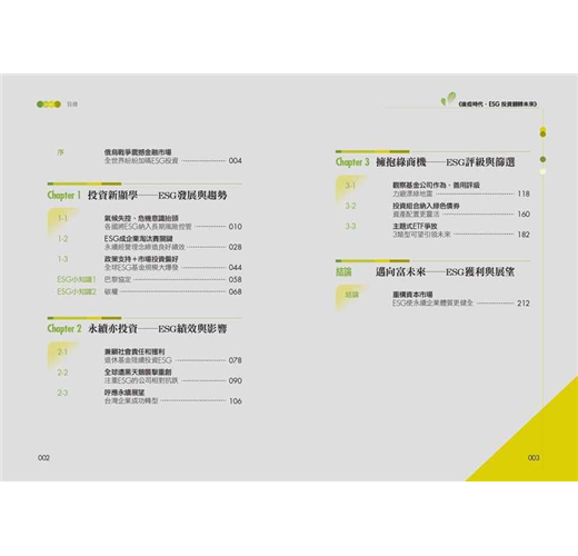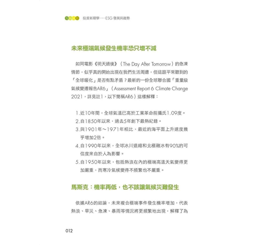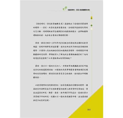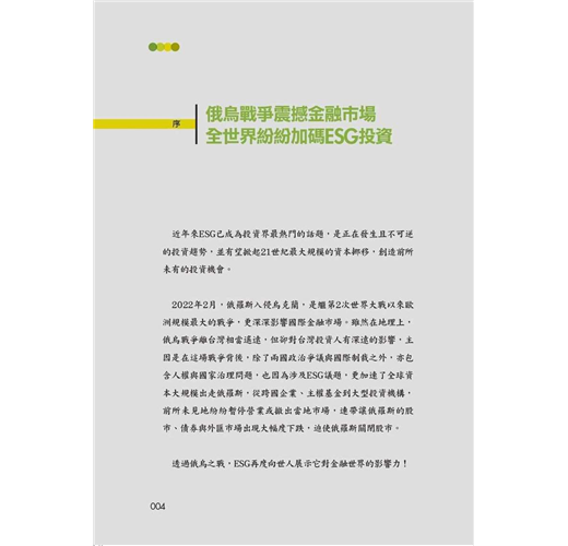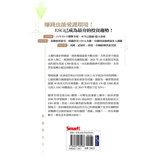 隨著全球這波ESG趨勢,台灣也迅速跟上腳步:政府表態2050年淨零碳排、各種ESG商品問世,龍頭企業也紛紛宣示ESG政策。然而,ESG雖然蔚為風潮,但投資時仍須留意幾個地方:如何確認投資商品符合自己的價值觀?是否有國際投資機構可以提供協助?如何避開「漂綠」問題?——所有相關解方,都在這本書裡告訴你!