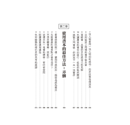 當然,有人說書是很神聖的,捨不得在書上標示記號。我建議的方法是,如果這本書真的可以幫你解決問題,你又很想好好珍藏,那就買兩本,一本用力畫,另一本就供起來放。作者提到的方法也可以參考,就是影印,因為這更方便摺疊與隨身攜帶。不過,為了使更多好書得以留存,用買的比列印更適合,也比較不會牽涉版權問題!