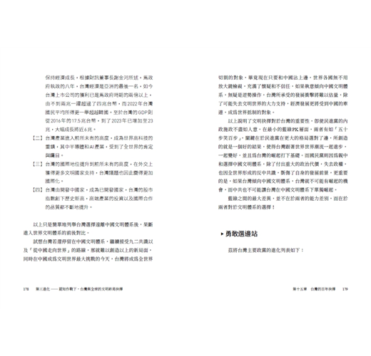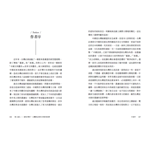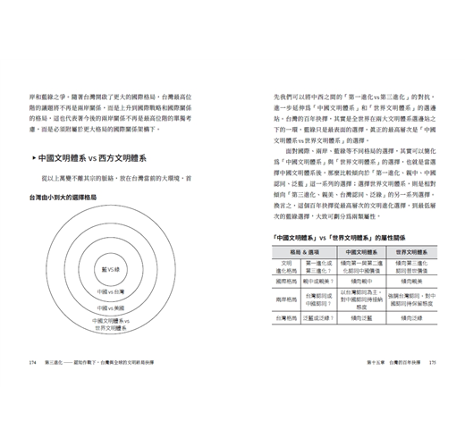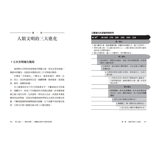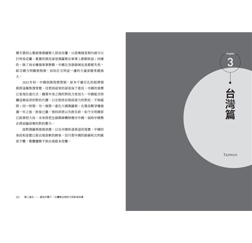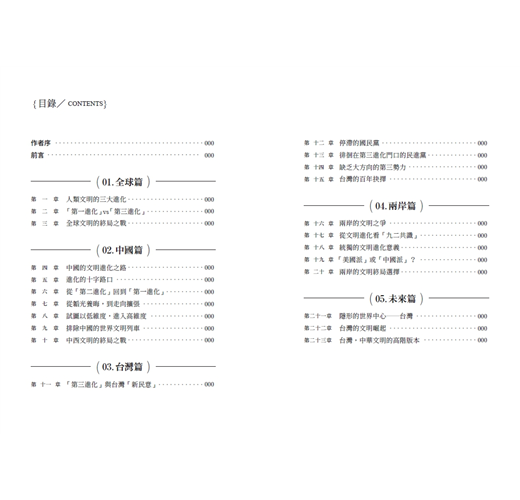 作者透過本書,大膽且明確的以文明進化的角度切入,甚至詳細剖析台灣各大政黨的核心路線,嘗試打造一個適合當前情勢的論述架構。