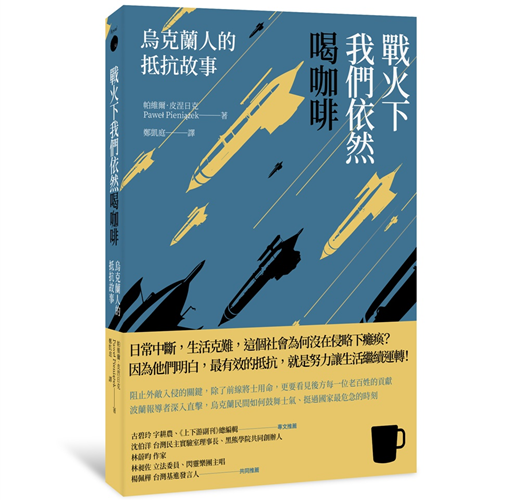 「看了《戰火下我們依然喝咖啡:烏克蘭人的抵抗故事》,讓我回想到在烏克蘭考察的那些天,觀察他們如何克服恐懼,努力的維持正常生活,讓戰爭對自身的影響降到最低。希望台灣人能了解戰爭其實並不遠,與想像中的模樣也差距很大,在這本書裡,可以讓你身歷其境、了解更多。」——楊佩樺_台灣基進發言人