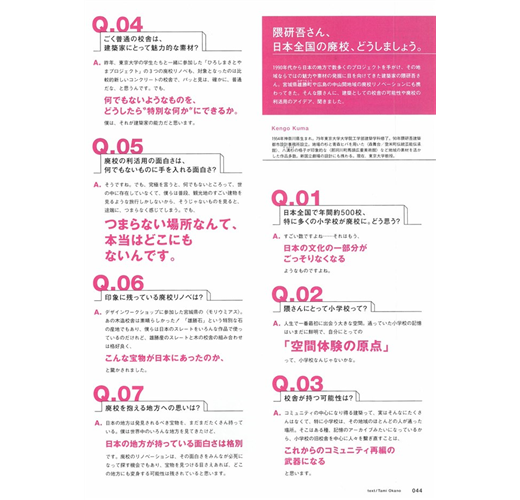 由於出生人數不斷下降,所以日本每年平均約有500間學校成為廢校,面對少子化的衝擊,或許無法減少廢校,但我們卻能夠思考該如何利用廢校。以「現在馬上想要使用的日本廢校」為主題,本期將要請到日本知名建築師來提案廢校的再利用方法。另外,本期還要介紹將廢校變成工作室兼事務所、將包裝工廠變成咖啡廳…等空間再利用實例。