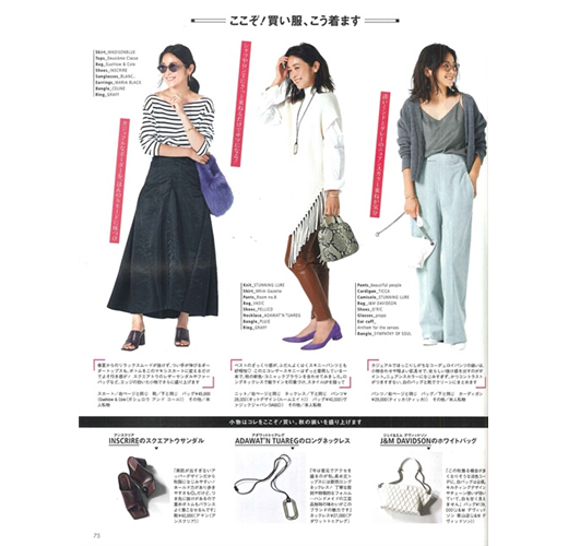 首先本期要請到人氣女星飯豐萬理江來為大家展示今年秋天流行的穿搭,並且還要請到繩田惠里、兵藤千尋…等人氣造型師來為大家介紹他們在今年秋天購買的單品以及搭配技巧。除此之外,還要為大家介紹今年秋天流行的高跟鞋與短靴,並且要教大家如何用高跟鞋與短靴來穿出秋季時尚,在秋天即將到來的現在,希望大家能夠透過本誌來快速掌握秋季流行。