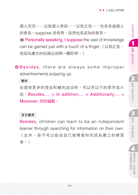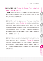 應用4.1:It would be dangerous if virtual materials replace printed books. First of all, children would lose interests in learning from paper books when they are obsessed by the abundant sound and visual effects of online materials. (Ch1 1-1)(首先,當孩子們著迷於網路材料豐富的聲光效果時,他們會失去從紙本書籍上學習的興趣。《節選自Ch1 1-1》)