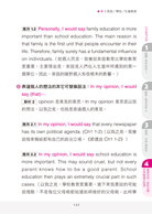 應用1.2:Personally, I would say family education is more important than school education. The main reason is that family is the first unit that people encounter in their life. Therefore, family surely has a fundamental influence on individuals. (就個人而言, 我會說家庭教育比學校教育更重要。主要理由是,家庭是人們在人生當中所遇到的第一個單位。因此,家庭的確對個人有很根本的影響。)