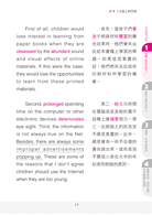 First of all, children would lose interests in learning from paper books when they are obsessed by the abundant sound and visual effects of online materials. If this were the case, they would lose the opportunities to learn from these printed materials.