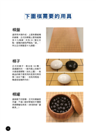 1. 從「第一次下圍棋」的新手角度設想內容,採用適合初學者學習的九路小棋盤,用最少且易懂的文字說明基本規則、下棋邏輯、正確心態與實用戰術。