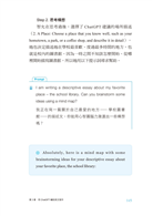 因為作者本身就是英文老師,而且實際在課堂上教導學生用AI輔助寫作,所以書中介紹的 ChatGPT 輔助寫作教學法、ChatGPT 寫作評鑑法特別值得英文教育人士參考,讓學生不只學會寫作技巧,還能運用網路與 AI 工具為自己的作文增色。