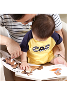 在共讀的過程中,你可以念出書中的句子,例如:「大耳朵的大象在哪裡?在積木的後面嗎?」讓孩子根據你的提示,觀察每一頁畫面,然後自己打開翻頁,享受「找到了!」的趣味。透過互動、有趣的閱讀歷程,培養寶寶思考和記憶的能力,讓寶寶動動手、也動動腦喔!