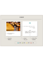 一起試著參考以上的範例與自己展開對話與練習。每一張卡片都是一種改變的機會與力量,涵蓋了「Question問問自己」、「Quote看名人說」、「Action Plan來練習吧」等三種從內而外的探索整理方式。你將會發現,自己也可以成為自己的人生整理師。