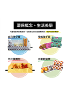 一塊可重複使用的食物布,僅50公克超輕巧設計、方便隨身攜帶!內層為通過歐盟認證、可直接接觸食物的TPU,耐熱達120度,防油防水,用濕布或洗碗精清洗,輕輕一擦就乾淨!快跟塑膠袋說byebye!