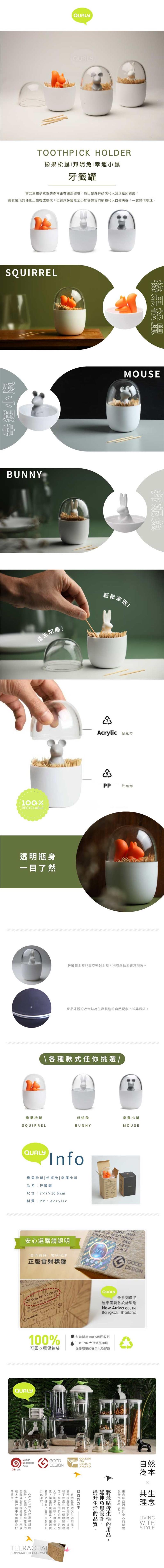 QUALY的設計一部分是以自然為本,常以動物、環境為題材,時時刻刻提醒我們大自然的美好,並傳達出「請多愛這個地球一點」的深層想法,人與動物、植物應該和平共處於大自然中,一同享受生態的美好,在自然的訴求中,更加入了創意、趣味、多彩、環保等元素,讓彼此碰撞出更多驚喜的火花,創造更豐富的設計,也藉此告知大眾,實用性與創意設計是可以美好並存的!