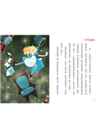「啊──」黑暗吞沒了她和她的聲音,愛麗絲心想,自己應該馬上就要摔死了,她忍不住嚎啕大哭。但過了一會兒,她才發覺自己往下掉的速度其實非常緩慢,根本沒那麼恐怖,而且原本黑暗的周圍竟然出現了微弱的光線,臉上掛滿淚痕的她,看見許多傢俱漂浮在空中,櫥櫃、木桌、書架……一把搖椅準確的滑落在她的身子下,她坐了進去,還從飄過來的書架中抽出一本書,書裡滿滿的是圖畫,真是一本好書!
