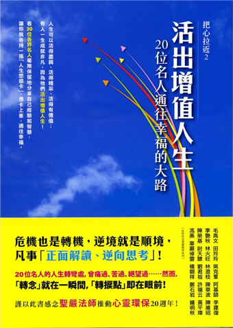 《把心拉近》一書去年出版後,各方反應熱烈,因此,人基會決定今年再接再厲,出版第二本《把心拉近》專書,書名定為《活出增值人生:20位名人通往幸福的大路》,書名與內容都非常吸引人,而且深具啟發性。書中的主角都是社會典範人物,他們經由不斷的自我提升與無私奉獻,不僅活出了增值的人生,也讓這個世界更加美好,生命的意義莫過於此。