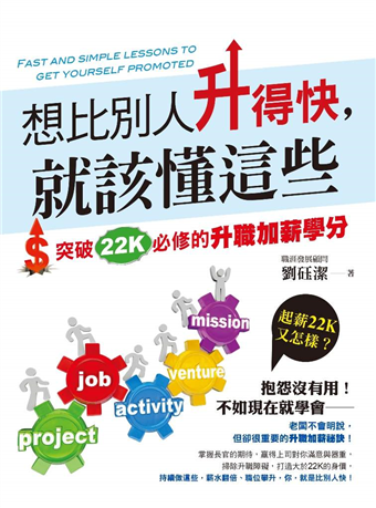 其實,「升不上去」的問題就出在你自己身上,不要再大嘆:「為什麼升遷名單沒有我?」,你缺少的並不是只有能力,還有克敵制勝的職場生存關鍵!本書詳列了升職的必備條件,與主管提拔下屬的原則。作者以她多年的經驗與讀者分享在職場上的生存之道,用平易近人及貼近生活的文字和例子,抓出你對工作的迷思與錯覺,提供你正面的職場生存智慧與技巧,值得你常常拿出來調整自己的狀態,在工作中找到自己的成就感與定位 ,贏得上司對你的滿意與器重,才有機會突破22K的魔咒,找到平步青雲、領先同儕的捷徑,扭轉你一輩子當小職員的命運!