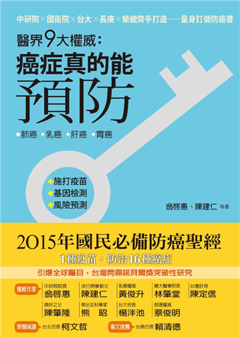 本書「醫界九大權威:癌症真的能預防」,收錄九大權威專家對癌症最新治療經驗、及預防癌症的建議,以及多位名家分享抗癌心得,針對國內常見的肺癌、乳癌肝癌、胃癌,從風險預測、預防到治療,一次完整呈現三階段歷程的實用書籍。