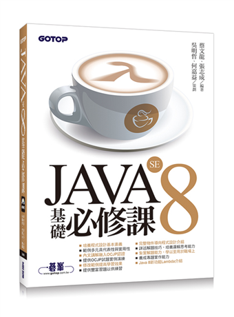 由OCJP(原SCJP)認證講師、科技大學教授程式設計教師以及OCJP認證專家共同編著,針對目前初學者學習程式設計所編寫的入門教材。