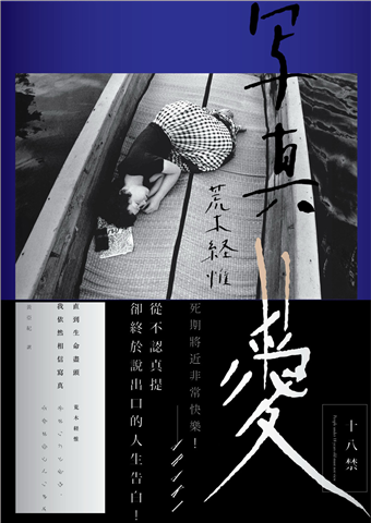 突破日版原書設計,封面影像選自《感傷之旅》攝影集——荒木在蜜月旅行中拍攝陽子躺在船上睡著的照片,這也是荒木經惟識別度最高的經典影像之一。書封採金銀雙色精緻印刷,搭配荒木十分有味道的手寫書法「寫真=愛」以及簽名,一如大師無畏坦蕩蕩的寫真人生,他的攝影要傳達的全都是愛。此張照片除了具有感傷、甜美、愛情⋯⋯象徵,更傳遞著一種生(如胎兒在子宮內縮捲軀體的姿勢)與死(躺著睡著了⋯⋯)的符號隱喻,也在在呼應著荒木經惟的「私.生.死」寫真人生。